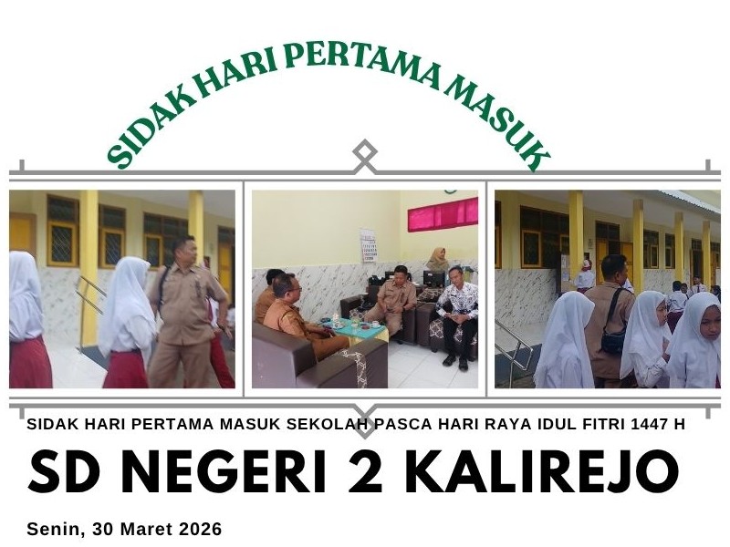 Pada hari pertama masuk sekolah setelah masa libur, Kepala Dinas Pendidikan melaksanakan kegiatan inspeksi mendadak (sidak) ke SD Negeri 2 Kalirejo Kec. Sumbermalang Kabupaten Situbondo guna memastikan kegiatan pembelajaran berjalan dengan baik. Kegiatan ini bertujuan untuk memantau langsung kehadiran guru, tenaga kependidikan, serta kesiapan siswa dalam memulai proses belajar mengajar.